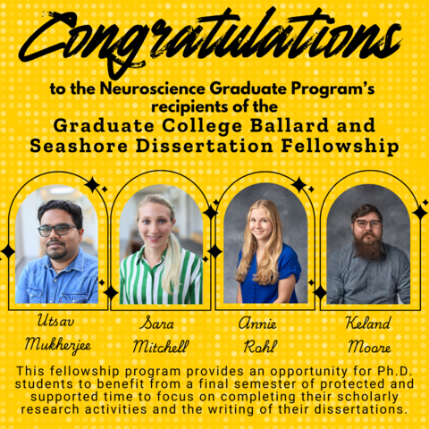 The Neuroscience Graduate Program is proud to announce that four of our students — Utsav Mukherjee, Sara Mitchell, Annie Rohl, and Keland Moore — have been awarded the Graduate College Ballard and Seashore Dissertation Fellowship.